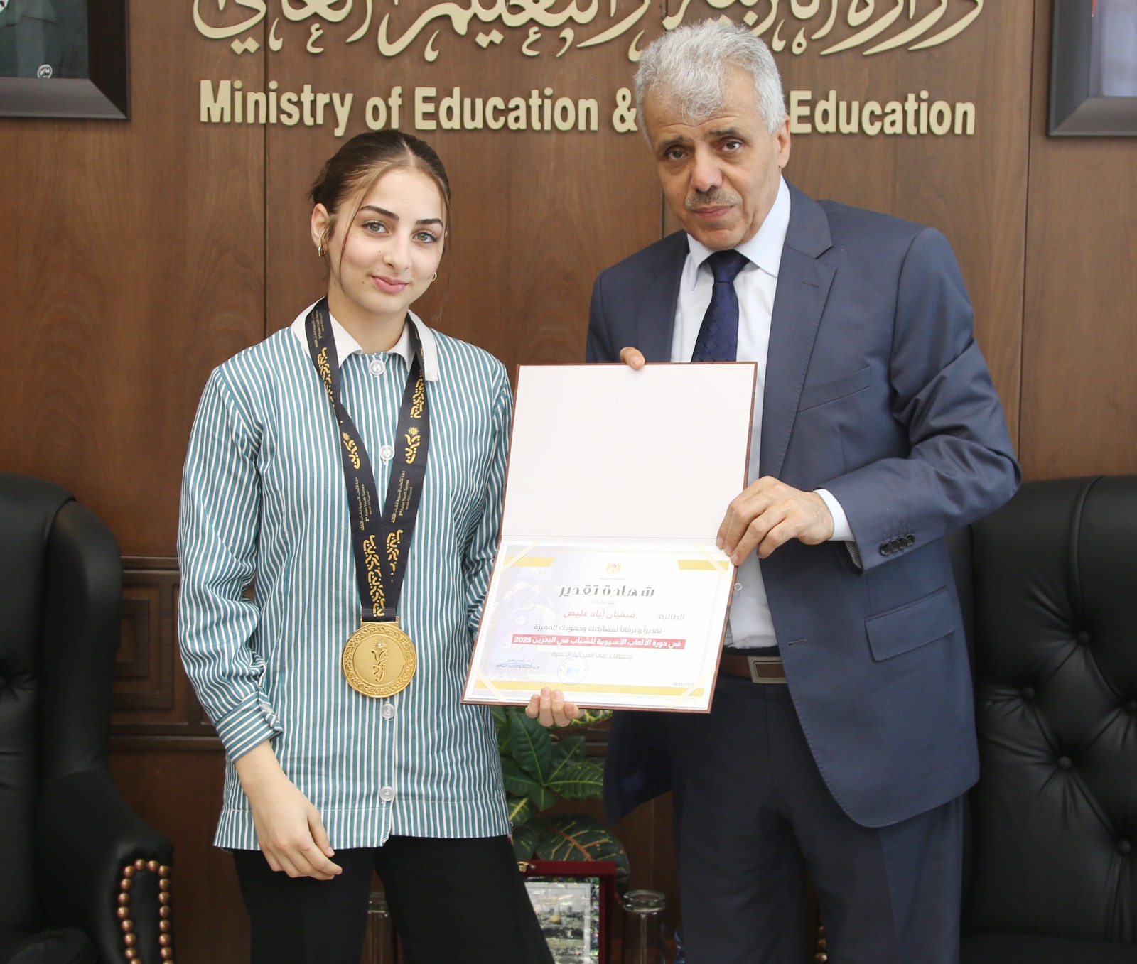 كرم وزير التربية والتعليم العالي أ.د. أمجد برهم، اليوم الثلاثاء، بطلة آسيا في المواي تاي الطالبة في مدرسة بنات البيرة الثانوية البطلة فيفيان عليص؛ لحصولها على أول ميدالية ذهبية لفلسطين في دورة الألعاب الآسيوية للناشئين (المواي تاي)، وذلك في البطولة التي أقيمت  مؤخرا في العاصمة البحرينية المنامة.