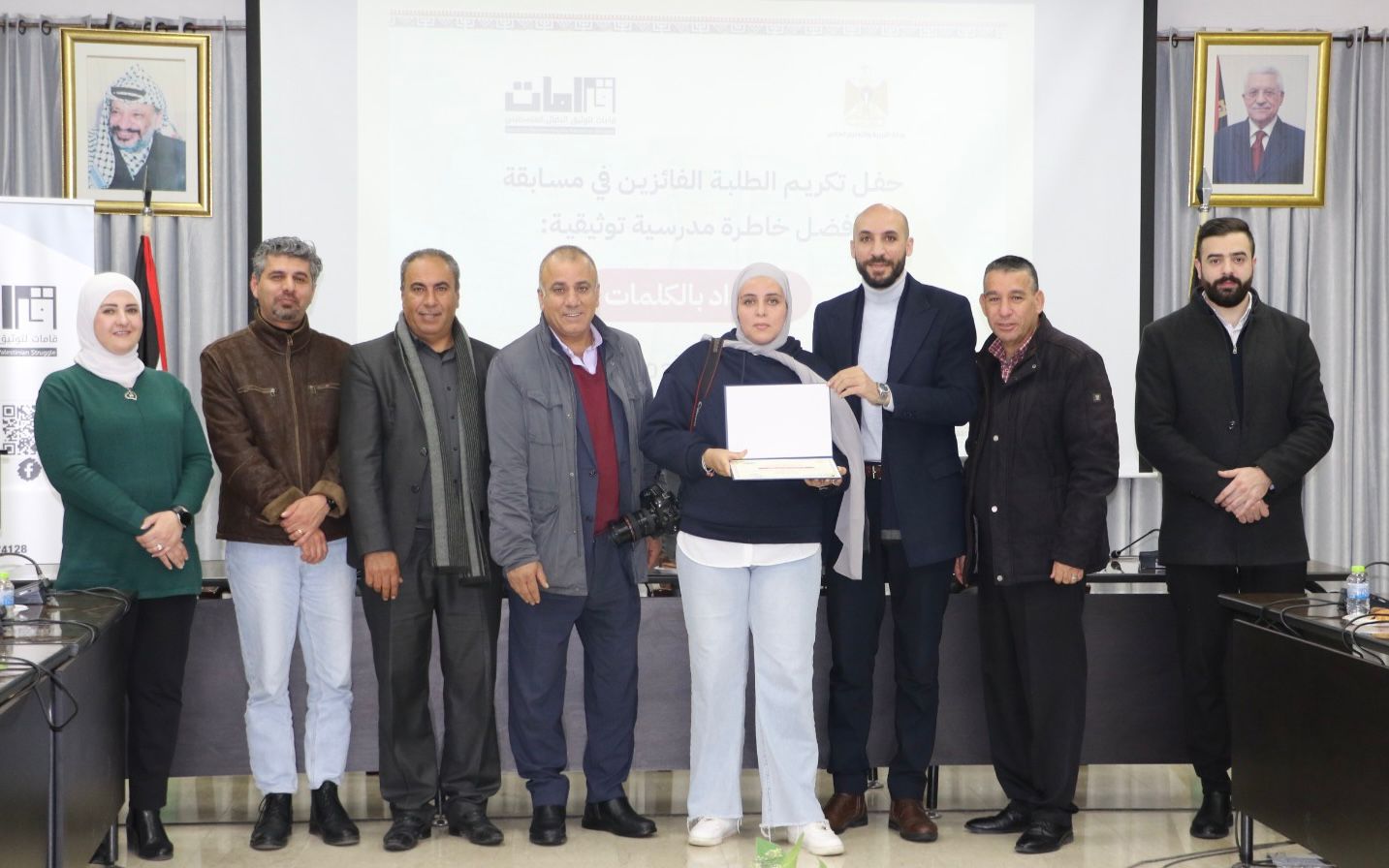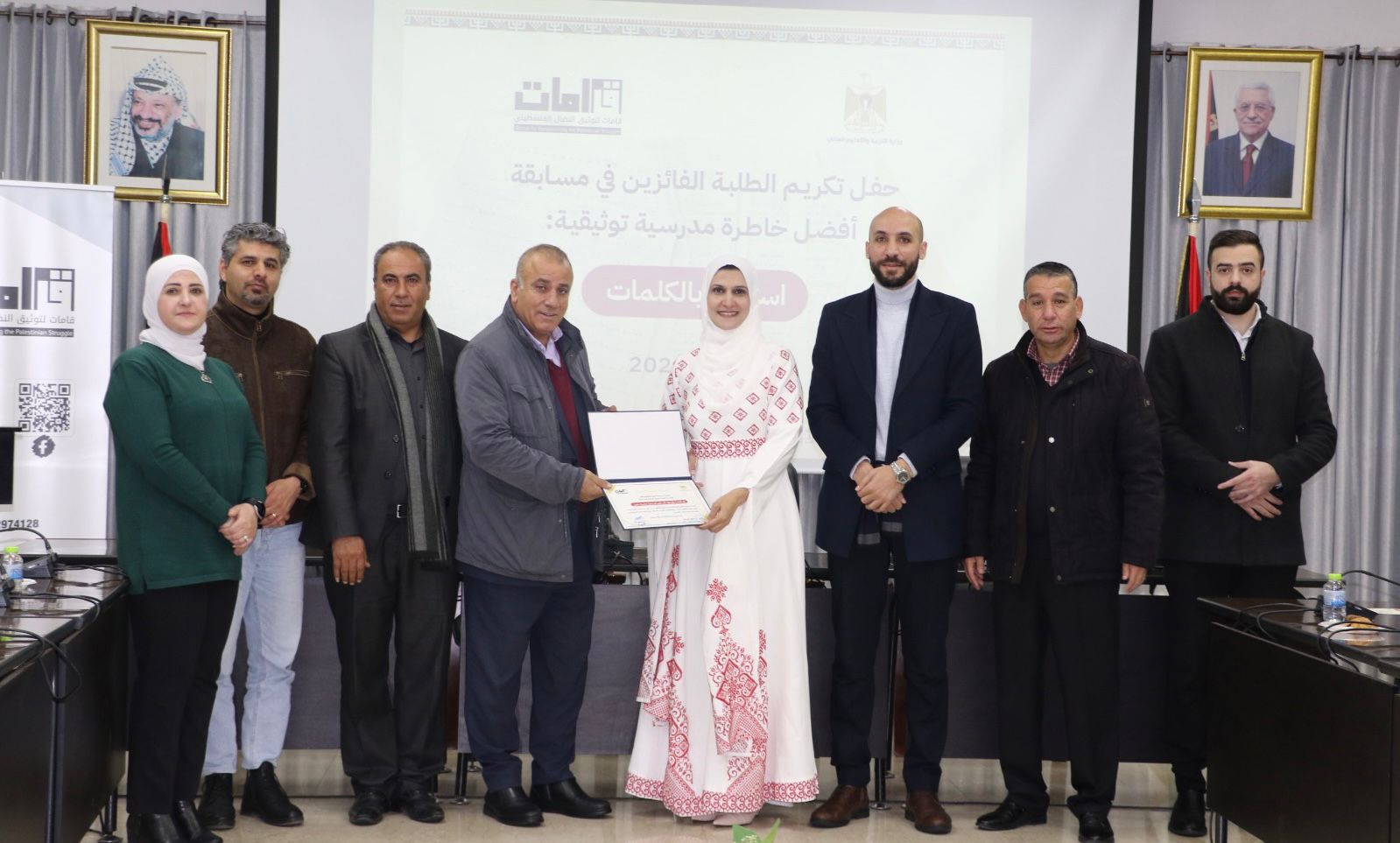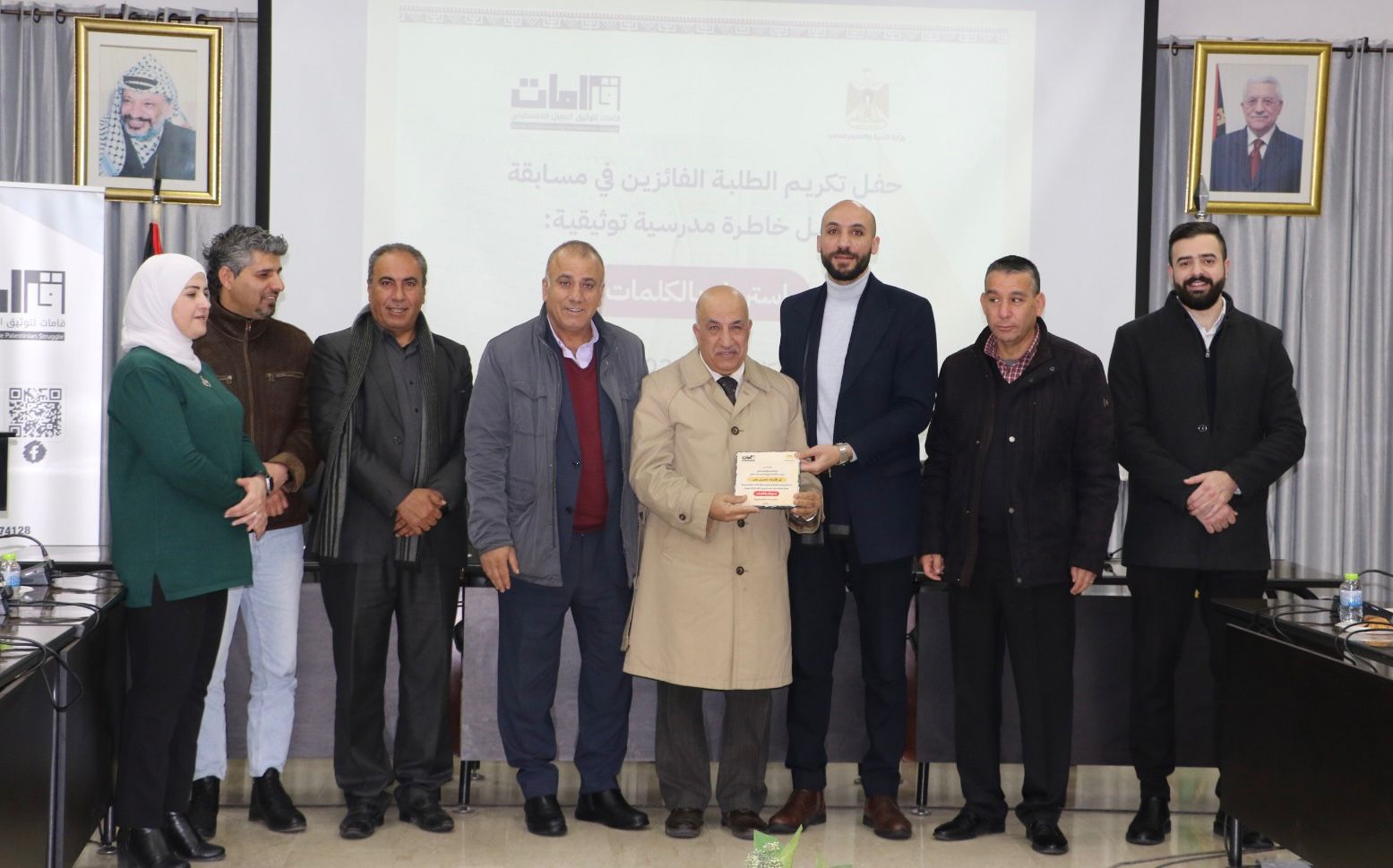 كرّمت وزارة التربية والتعليم العالي، ومؤسسة قامات لتوثيق النضال الفلسطيني، اليوم الأربعاء، الطلبة الفائزين في مسابقة أفضل خاطرة مدرسية وطنية توثيقية حملت عنوان: "استرداد بالكلمات"، وجاءت استلهاماً من فيلم قامات الوثائقي "استرداد مؤجل" للمخرج الأسير عبد الله معطان، الذي يوثق معاناة ذوي الشهداء المحتجزة جثامينهم في ثلاجات الاحتلال.
