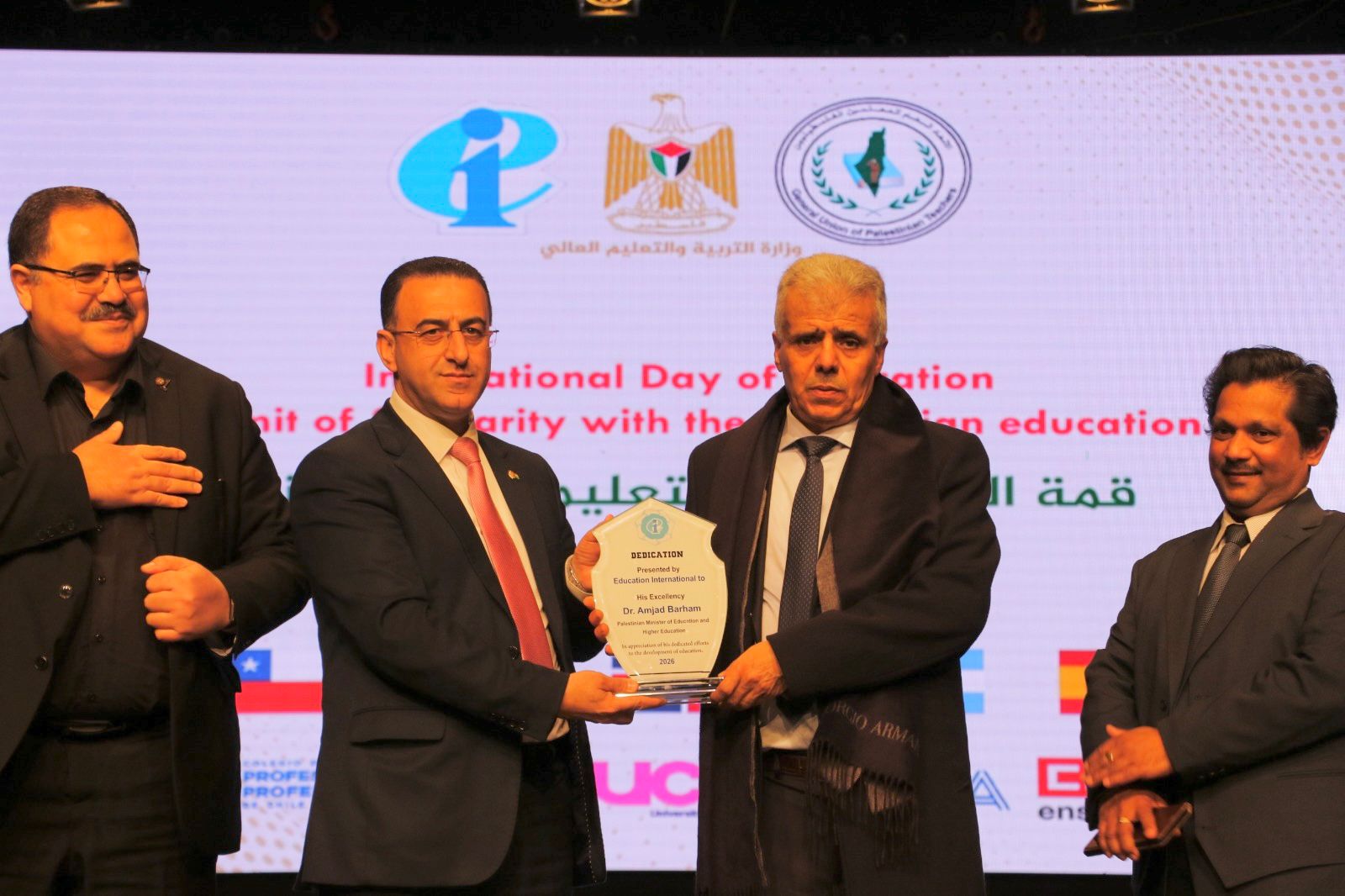 وألقى الأمين العام للدولية للتعليم ديفيد إدوارد، وممثلو النقابات التعليمية العالمية، كلمات عن بُعد، أكدوا فيها أن منعهم من الدخول جسدياً لم يمنع أرواحهم وتضامنهم الصادق من الاستقرار في وجدان المعلم الفلسطيني. وشدد إدوارد على أن "الإسناد الفعلي للتعليم في فلسطين، وتحديداً في غزة، هو واجب أخلاقي لا يسقط بالمنع"، متعهداً بإيصال صوت المعلم والطالب الفلسطيني إلى كل المحافل العالمية، والوقوف سداً منيعاً في وجه محاولات إسكات وطمس الهوية الفلسطينية.