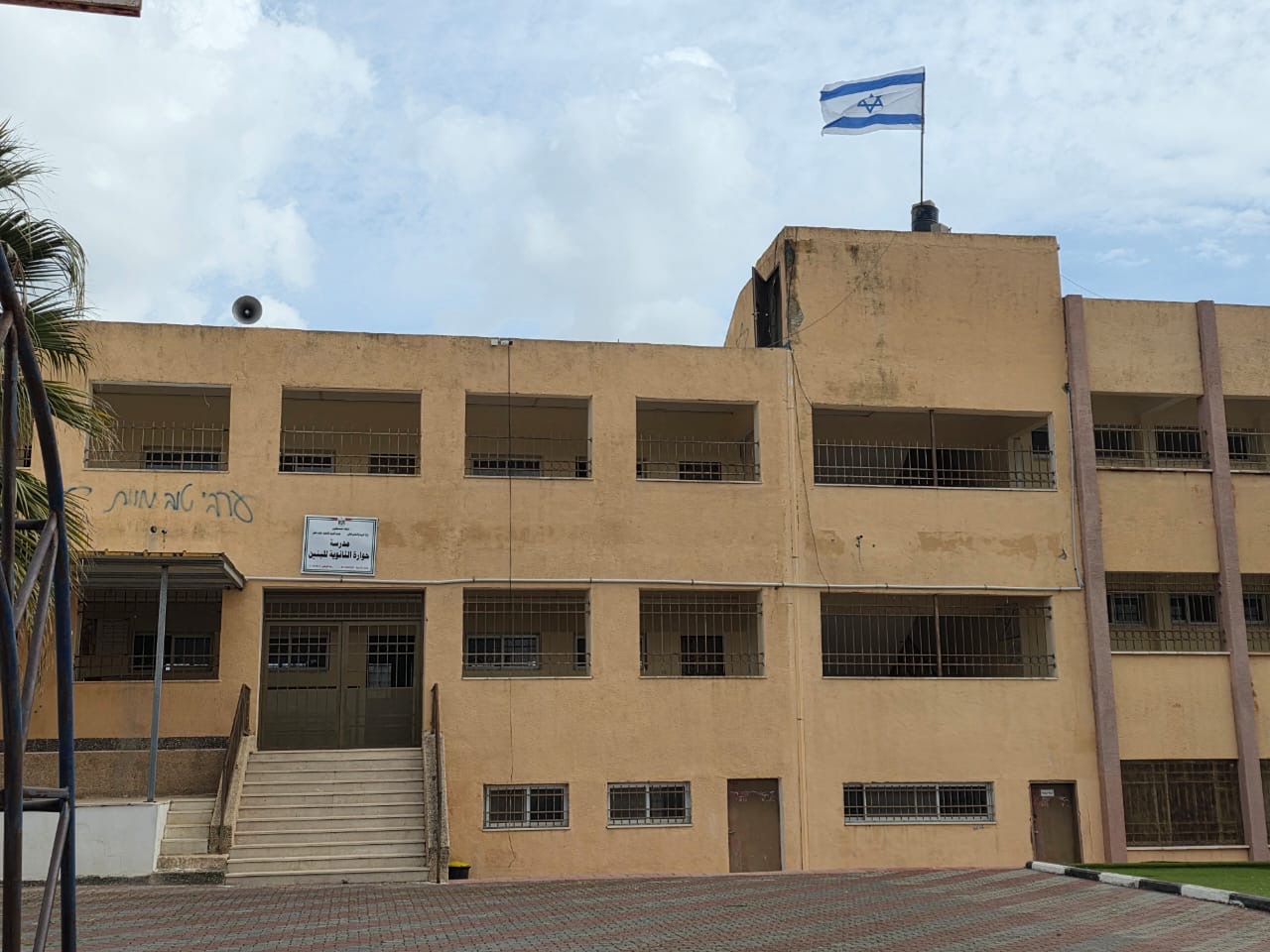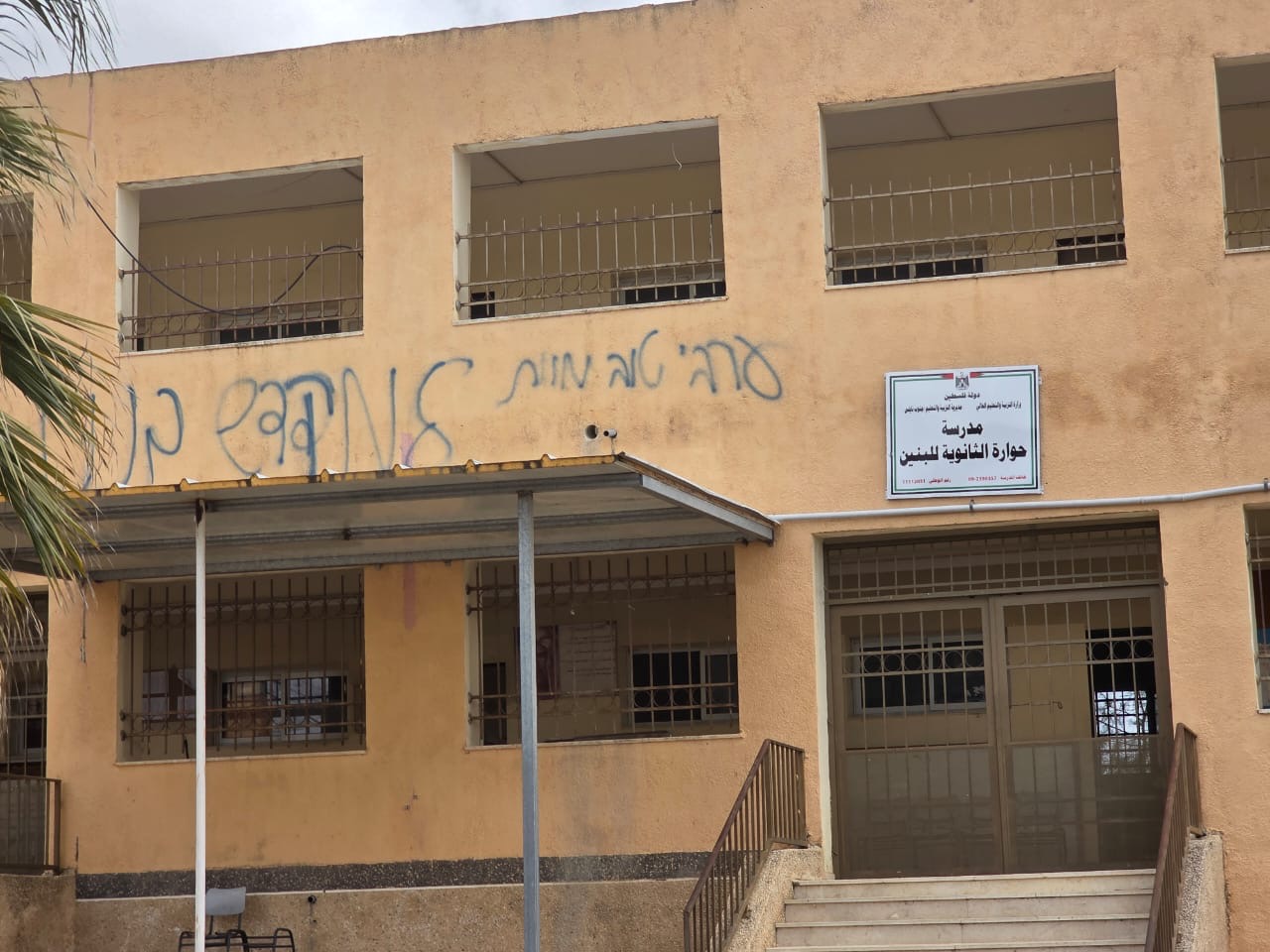 In a clear violation of the sanctity of educational institutions and an attack on the safety of the learning environment, Israeli settler gangs stormed Huwara Boys’ Secondary School in South Nablus Education Directorate, raised the Israeli flag on school grounds and the sprayed hostile graffiti on its walls.