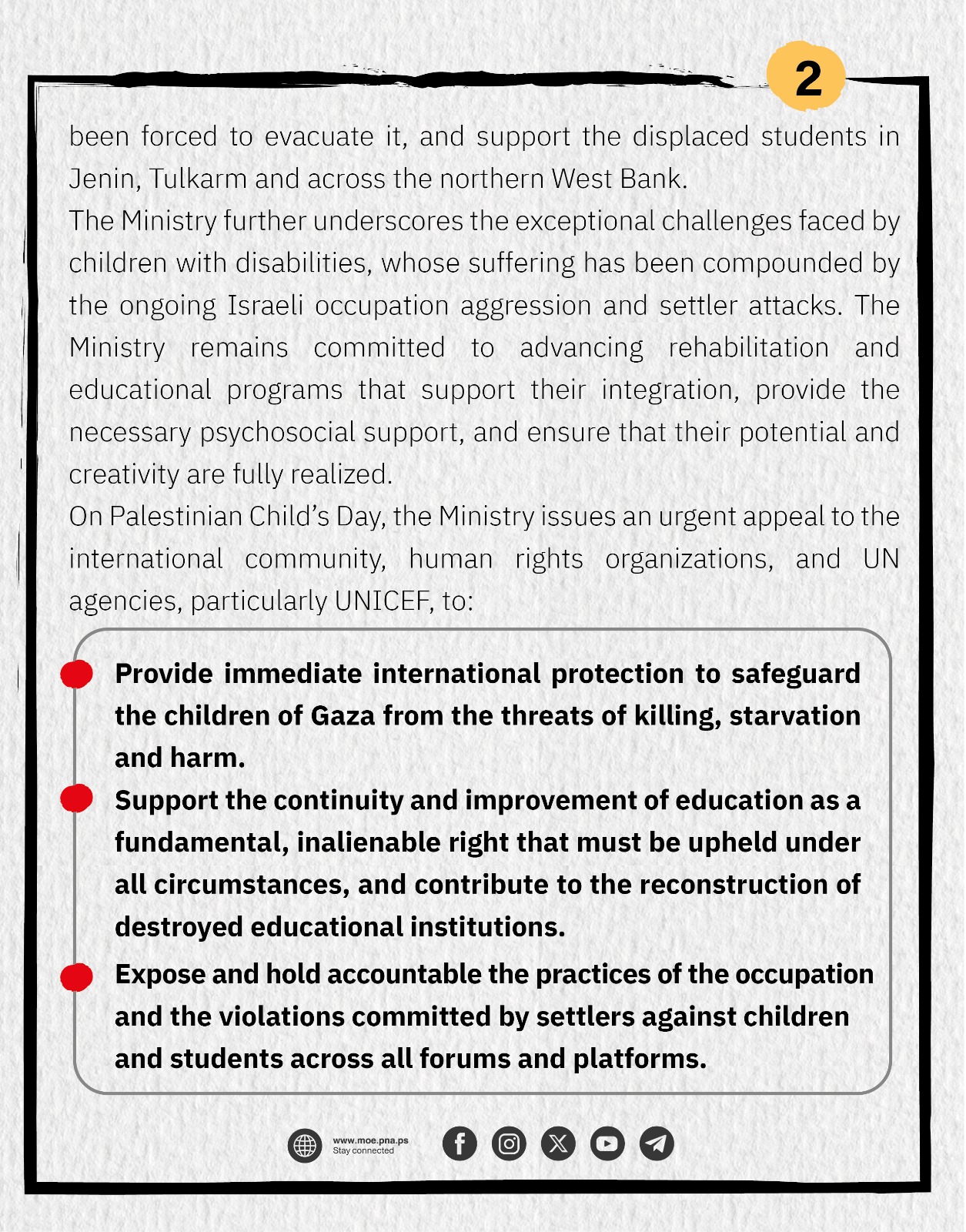 April 5, 2026 This year, Palestinian Child’s Day arrives in a reality both complex and unmistakably clear: the cries of Palestinian children reverberate against a wall of international silence, confronting an unrestrained machinery of killing and destruction. Yet, their will to live remains unbroken, and their resolve to learn unwavering. From tents amid the rubble, they send a message to the world: knowledge in Palestine cannot be extinguished. Over the past two years, Palestinian children have endured a systematic war of extermination targeting their very existence and their fundamental right to life. In the gravest crime against humanity in the modern world, more than 19,000 schoolchildren have been martyred, while hundreds of thousands of children in the Gaza Strip remain without shelter or security, facing hunger, disease, and repeated displacement. In this context, the Ministry of Education and Higher Education affirms that targeting schools and educational institutions will not deter it from fulfilling its mission and upholding the right to education. It will continue to operate virtual schools and temporary learning centers for children in Gaza, support students who have been forced to evacuate it, and support the displaced students in Jenin, Tulkarm and across the northern West Bank. The Ministry further underscores the exceptional challenges faced by children with disabilities, whose suffering has been compounded by the ongoing Israeli occupation aggression and settler attacks. The Ministry remains committed to advancing rehabilitation and educational programs that support their integration, provide the necessary psychosocial support, and ensure that their potential and creativity are fully realized. On Palestinian Child’s Day, the Ministry issues an urgent appeal to the international community, human rights organizations, and UN agencies, particularly UNICEF, to: - Provide immediate international protection to safeguard the children of Gaza from the threats of killing, starvation and harm. - Support the continuity and improvement of education as a fundamental, inalienable right that must be upheld under all circumstances, and contribute to the reconstruction of destroyed educational institutions. - Expose and hold accountable the practices of the occupation and the violations committed by settlers against children and students across all forums and platforms.